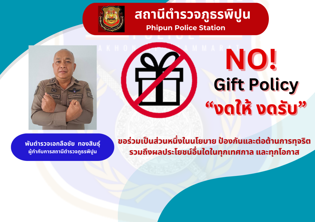วันจันทร์ ที่ 7 ธ.ค.66 เวลา 08.30 น. พ.ต.อ.ลือชัย ทองสินธุ์ ผกก.สภ.พิปูน, พ.ต.ท.อัชฌาส์ อ่อนศรีแก้ว รอง ผกก.ป.สภ.พิปูน, พ.ต.ท.พิจักษณ์ สุวรรณภักดี รอง ผกก.สส.สภ.พิปูน, พ.ต.ท.เกียรติพงศ์ เสมสุขกรี รอง ผกก.(สอบสวน) สภ.พิปูน พร้อมด้วยข้าราชการตำรวจในสังกัดทุกนาย ร่วมกันจัดกิจกรรมประกาศเจตนารมย์ไม่รับของขวัญ ของกำนัล หรือประโยชน์อื่นใด (No Gift Policy) จากการปฏิบัติหน้าที่ บริเวณด้านหน้าอาคารที่ทำการ สภ.พิปูน
