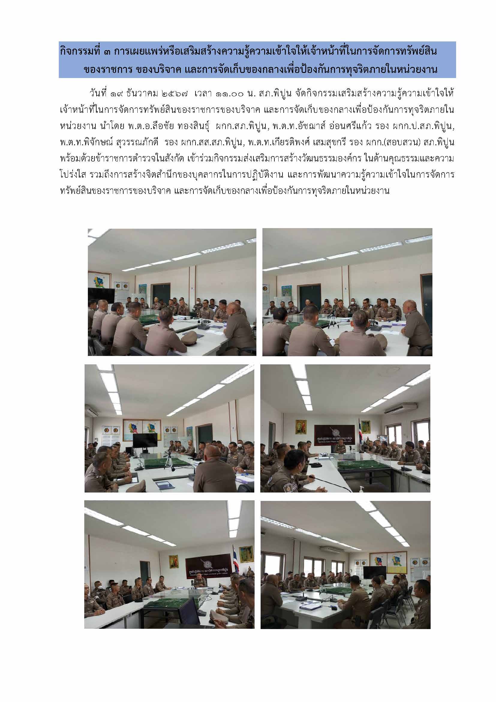 กิจกรรมเสริมสร้างความรู้ความเข้าใจให้เจ้าหน้าที่ในการจัดการทรัพย์สินของราชการของบริจาค และการจัดเก็บของกลางเพื่อป้องกันการทุจริตภายในหน่วยงาน 19 ธันวาคม 2567 โดย xpfreeman / การมีส่วนร่วมของหัวหน้าสถานีตำรวจ,กิจกรรม ITA,ข่าวประชาสัมพันธ์,ผลการปฏิบัติงานของ สภ.พิปูน,งานอำนวยการ Post Views: 31 FacebookFacebookXXLINELine