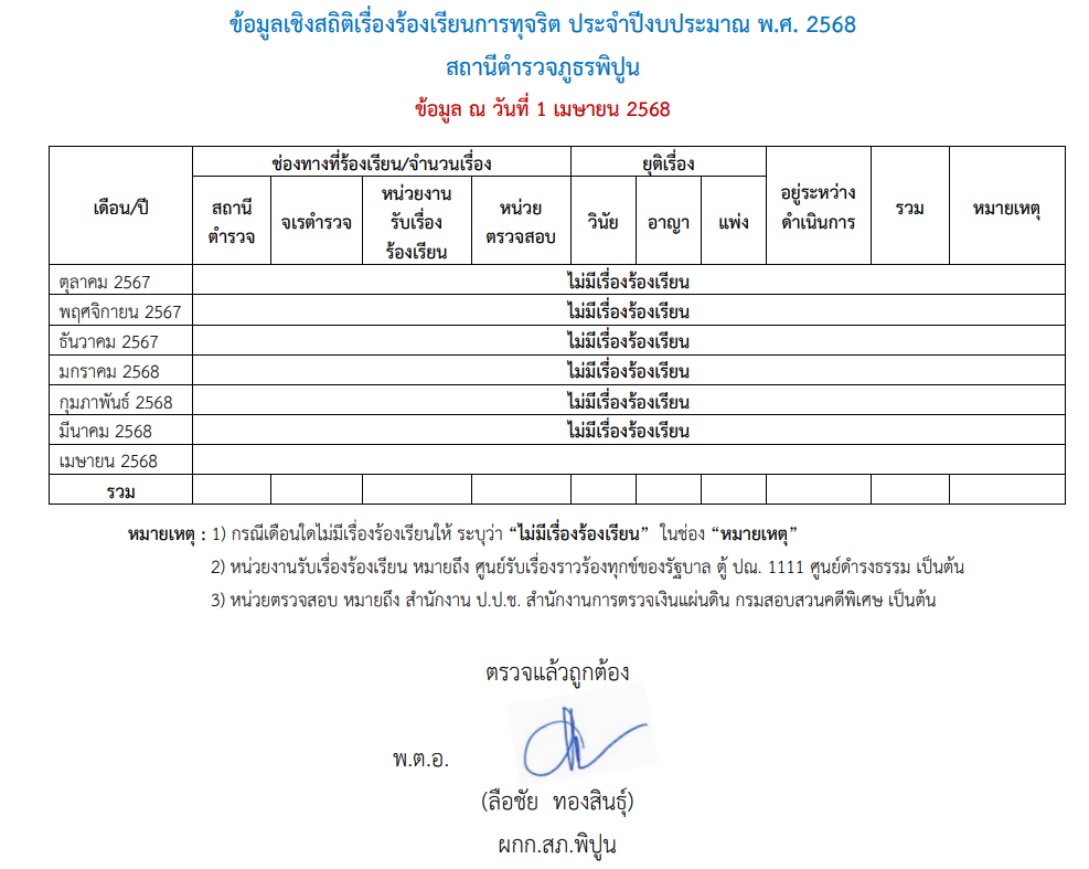 ข้อมูลเชิงสถิติเรื่องร้องเรียนการทุจริต ปีงบประมาณ พ.ศ. 2568
