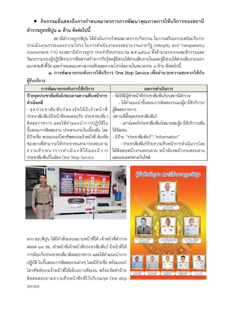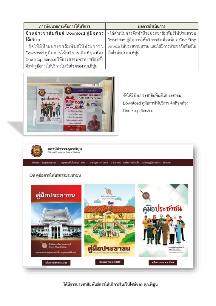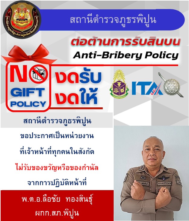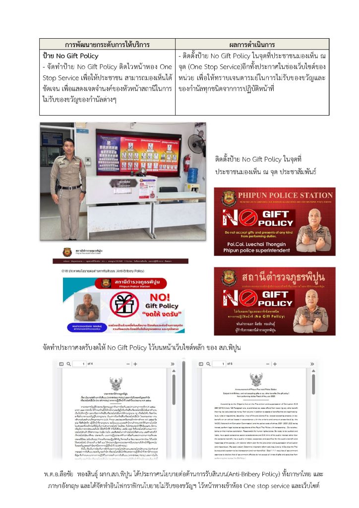ติดไว้ในจุด บริการของสถานี และลงเว็บไซต์ของ สภ.พิปูน เพื่อให้ประชาชนทราบว่า หน่วยงานประกาศว่าเจ้าหน้าที่ทุกคนในสังกัดไม่รับของขวัญหรือของกำนัลจากการปฏิบัติหน้าที่ และต่อต้านการรับสินบน โดย มี พ.ต.อ.ลือชัย ทองสินธุ์ ผกก.สภ.พิปูน หัวหน้าหน่วยงานประกาศ
